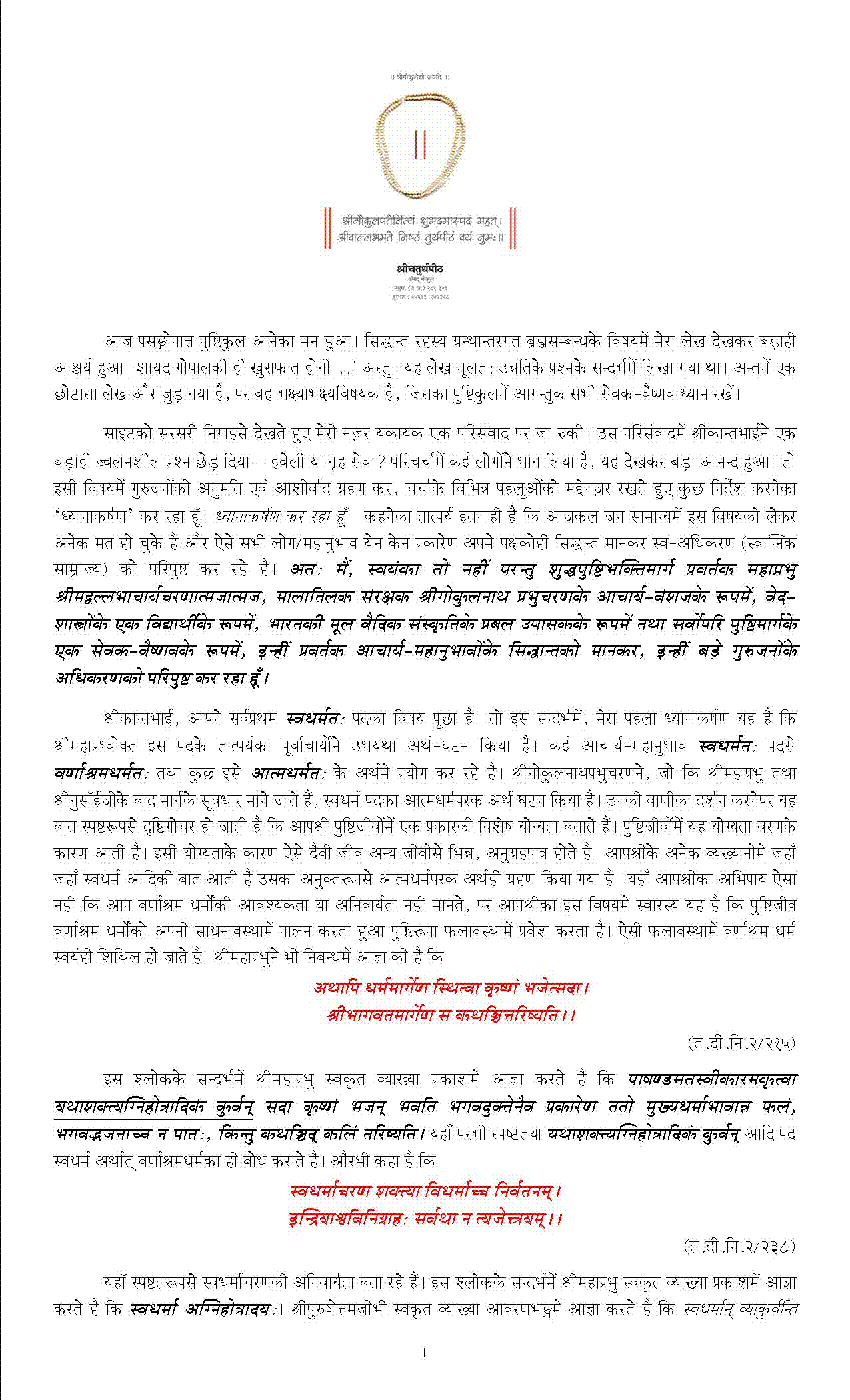Now someone can counter-question to me that when there is rule-there is exemption. Yes, but here exemption cannot help us the, because neither we follow orders of ShriMahaprabhuji, or nor of our own ShriGurucharan, then how the exemption-apvaad will work????? Shrimahaprabhuji gave aagyna that Seva Krutir Guror Aagyna .... Bandhanam vaa Hariicchaya.... To do seva according to the orders of our ShriGuruchran, but if ShriPrabhu's wish differs from ShriGUrucharan's orders, then u can follow ShriPrabhu's wish. That means a rule is to follow orders of ShriGuruchran, but also shown that exemption can be taken if shriprabhu's wish is different.