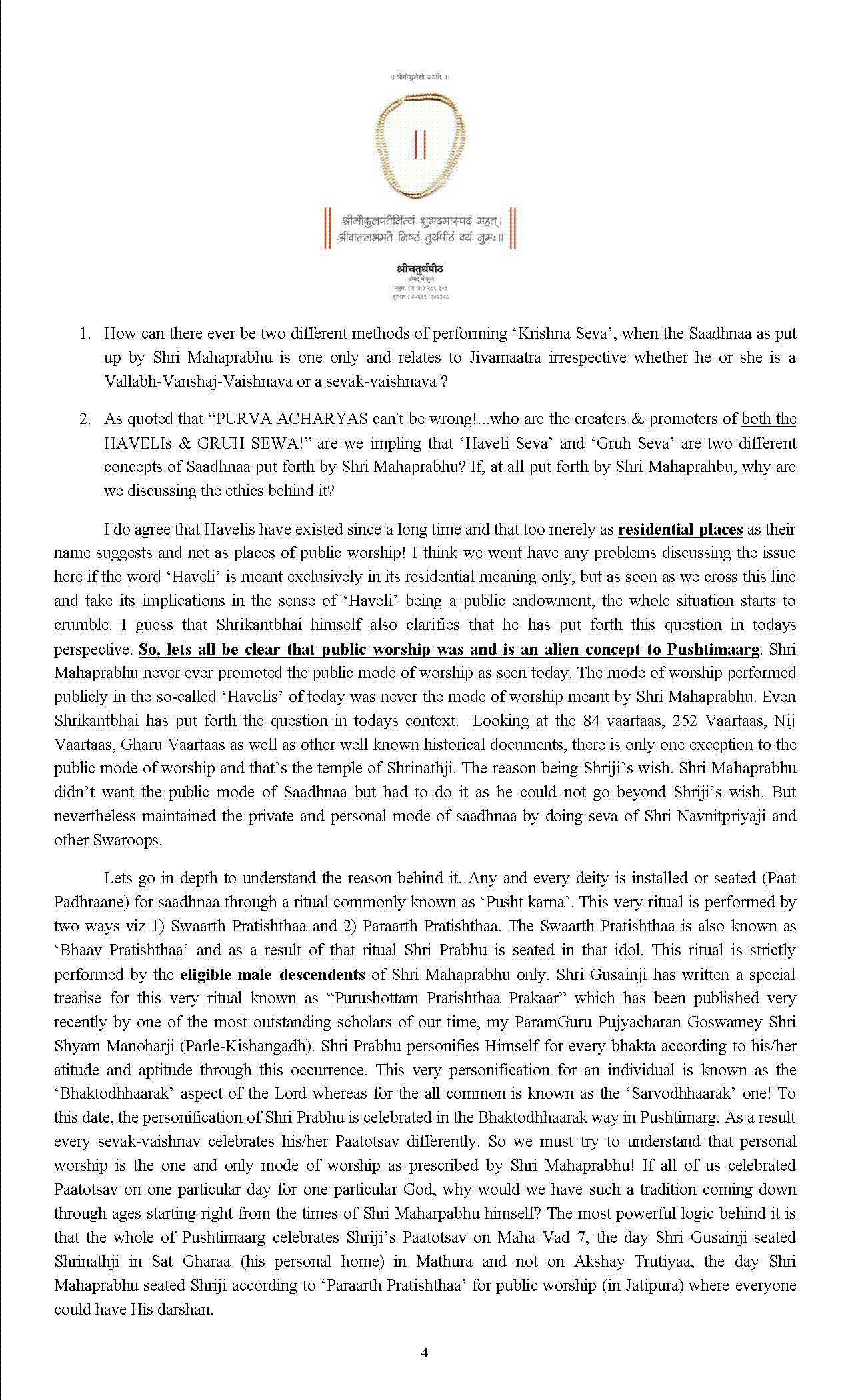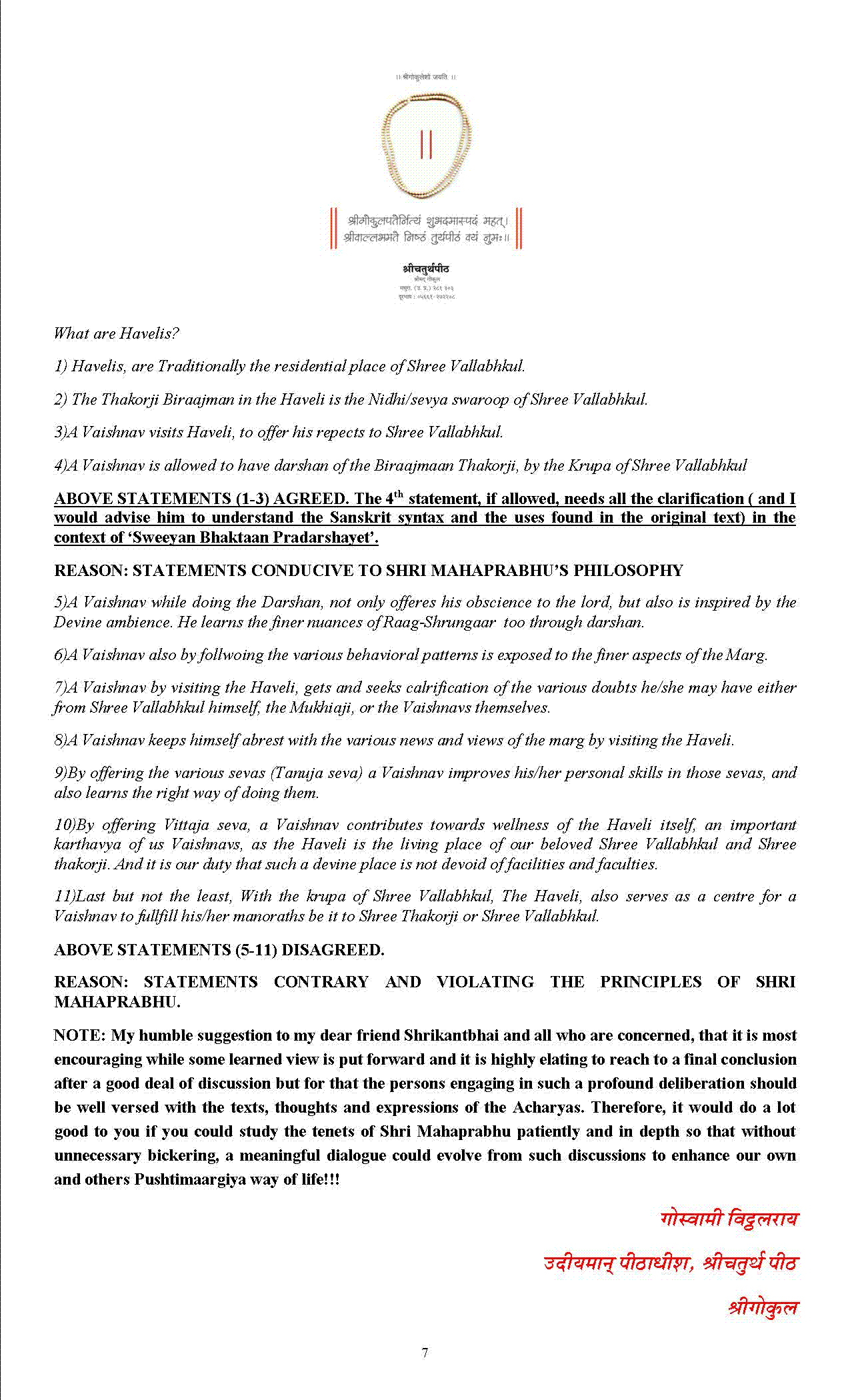 To touch on something that was said earlier. To prevent a Haveli from being a devalay/temple Goswami Balaks and Betijis should given the opportunity to overlook and be throughly involved in its running and ensure that seva is performed as per the principles.